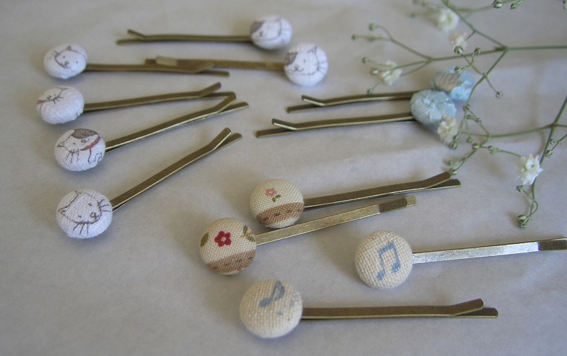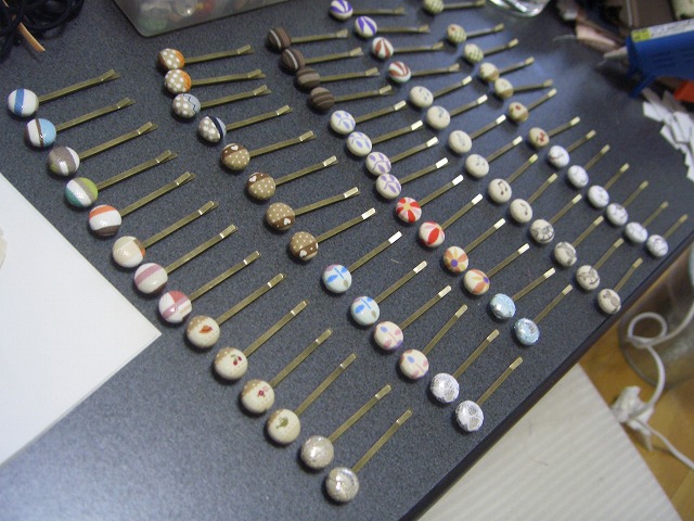 そして、とりあえず2ヵ月…とのお話だったのですが、先日秋物をそろそろとのご連絡がw さっそくヘアピンを100個購入し、作成開始! 昨日一気に35セットくらいを作りました。 指とか爪とか色々痛いよぅ(ノ_<。) 接着面を乾かしている時にパシャリ ![]() 多っ!!Σ(・ω・ノ)ノ